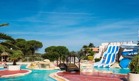 Groot zwembad met glijbanen, Een echte waterval, Langzaam aflopend strand op 900 m, Waterratten de hele dag zoet, Groene omgeving, Animatie voor jong en oud